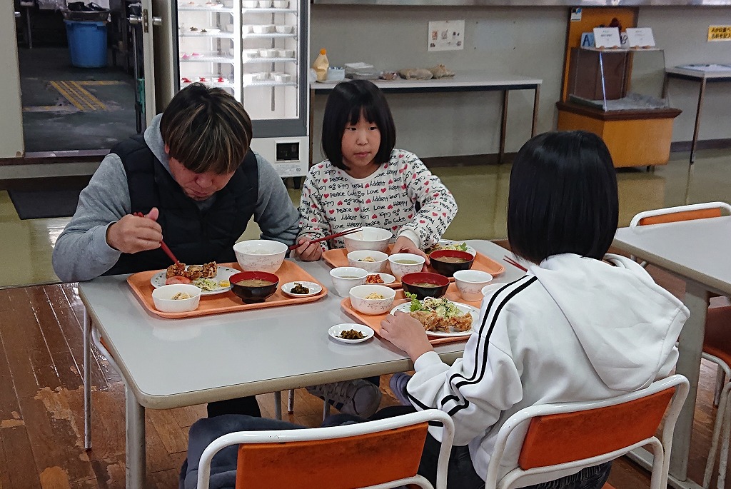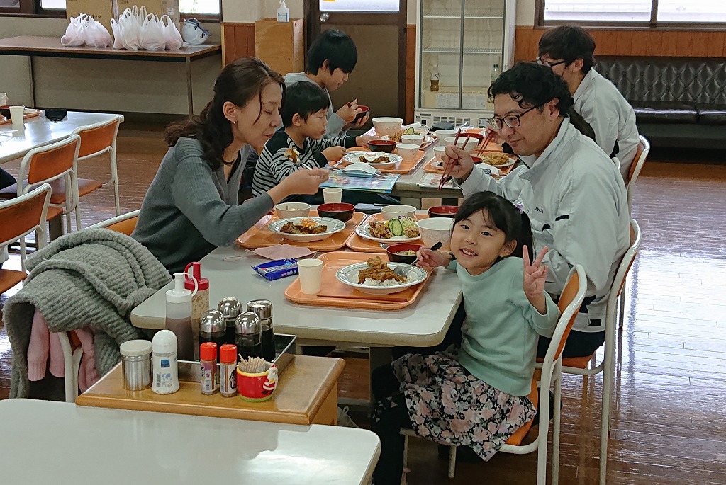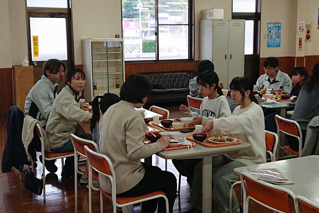 見学の後は食堂で食事を囲み、笑顔で語り合うひとときに。社員にとっても、家族にとっても心に残る一日となりました。