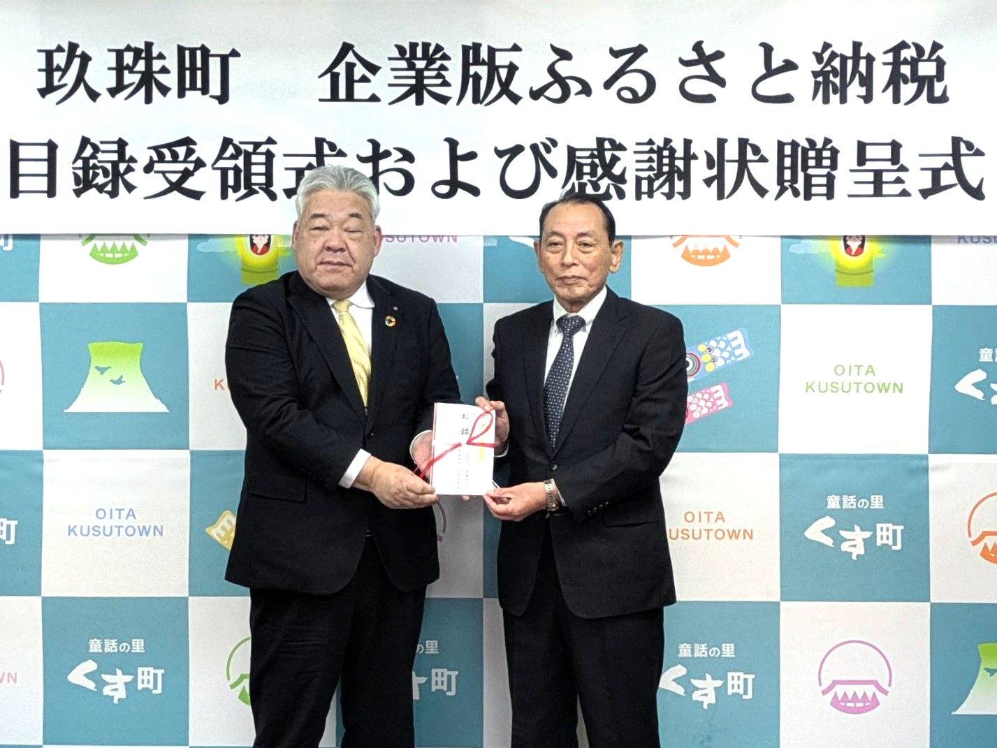 | 【写真】目録贈呈の様子 宿利 政和 玖珠町長(左) |